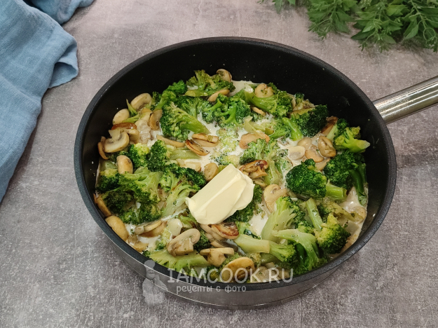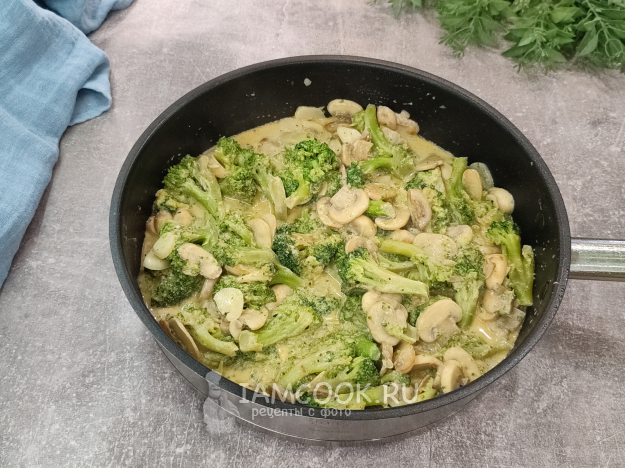 Брокколи с грибами в сливочном соусе готова! Подавайте с пылу с жару!