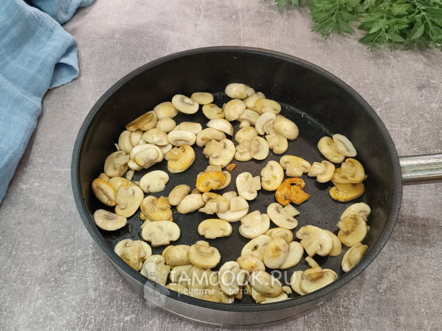 В сковороде на разогретом оливковом масле обжарьте грибы до появления легкой румяной корочки.