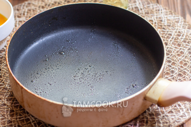 Возьмите сковороду с антипригарным покрытием и сбрызните ее маслом. Если нет распылителя на бутылке с маслом, то налейте немного (около одной чайной ложки) и смажьте сковороду кисточкой. Разогрейте сковороду с маслом и убавьте нагрев до среднего.
