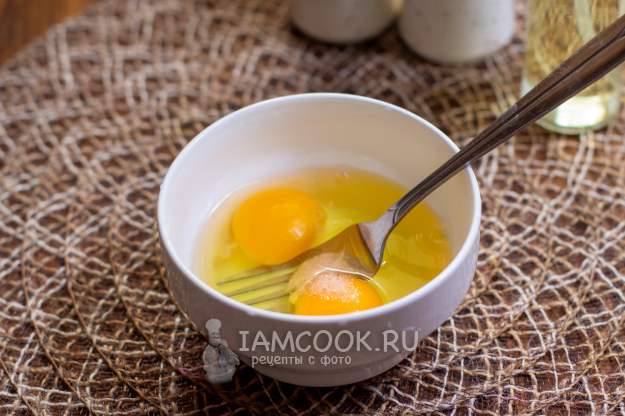 В подходящую емкость вбейте два небольших яйца, посолите их и перемешайте вилкой. Взбивать не нужно, достаточно лишь, чтобы белок и желток соединились.