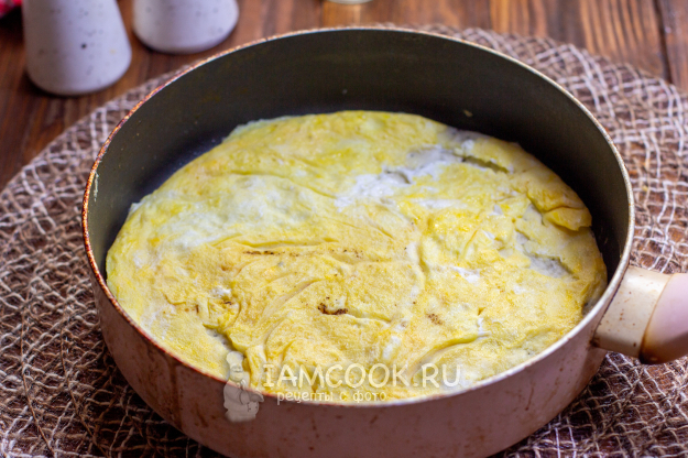 Сверху на яйца положите тортилью и прижмите ее слегка рукой. Готовьте еще минуту-две.