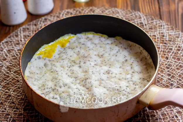 При помощи лопатки аккуратно переверните лепешку вместе с омлетом из яиц, накройте крышкой и готовьте еще 2-3 минуты.