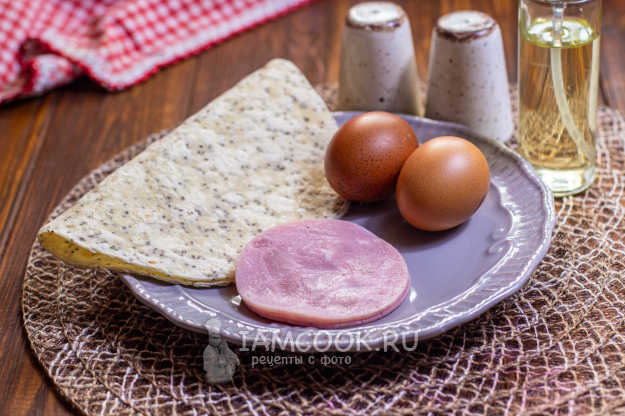 Соберите необходимые продукты для приготовления тортильи с омлетом и ветчиной. Нам понадобится сама лепешка тортилья, диаметром 22 сантиметра, парочка яиц и немного ветчины. По желанию, вы можете дополнить блюдо сыром, овощами или зеленью.