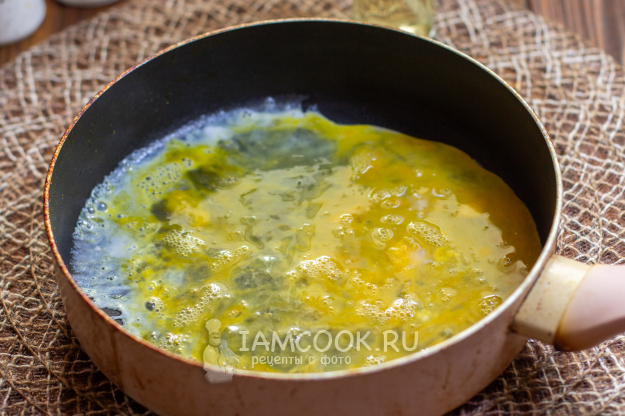 Вылейте на сковороду яичную смесь и готовьте несколько минут, чтобы яйца слегка схватились.