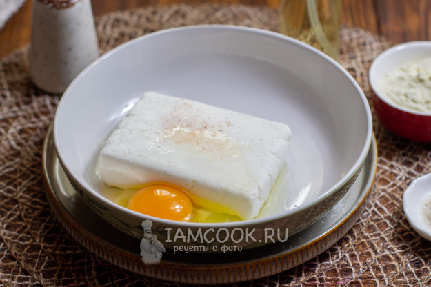 В подходящую емкость выложите творог и добавьте к нему щепотку соли и небольшое яйцо. Крупное яйцо лучше смешать отдельно в пиале и добавить половину. Разомните удобным для вас способом творог и соедините с яйцом.