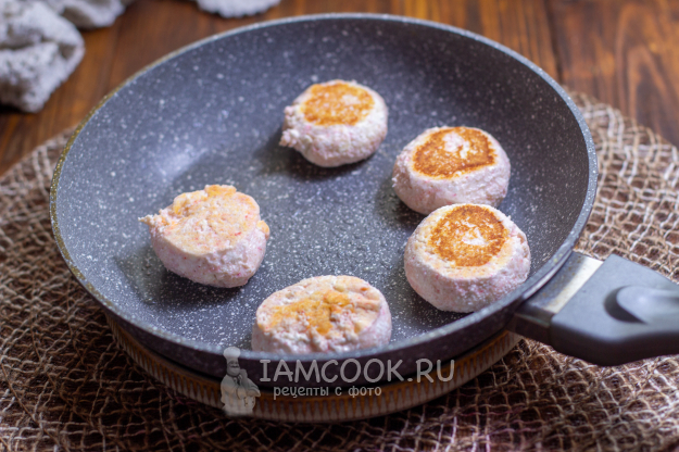 Слегка влажными руками сформируйте сырники и обжарьте на сковороде, сбрызнув маслом, с двух сторон по минутке. Зажаривать сырники не нужно, а лишь довести до лёгкой корочки.