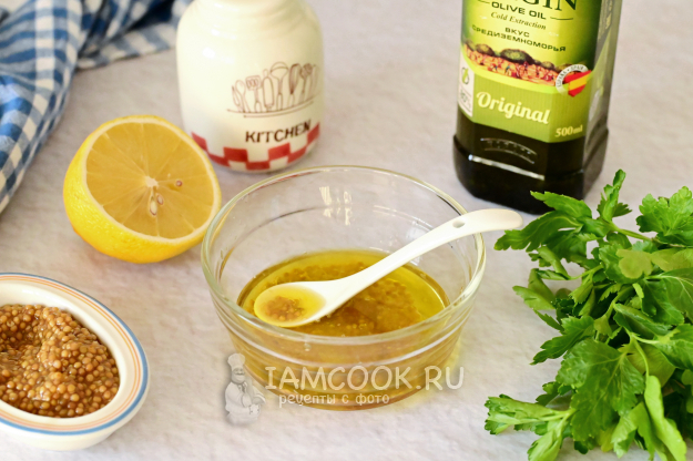 Для заправки в мисочку положите зернистую горчицу, добавьте немного соли, лимонного сока и влейте оливковое масло.