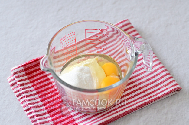В миску положите сливочное масло, добавьте соль, сахар и яйца.