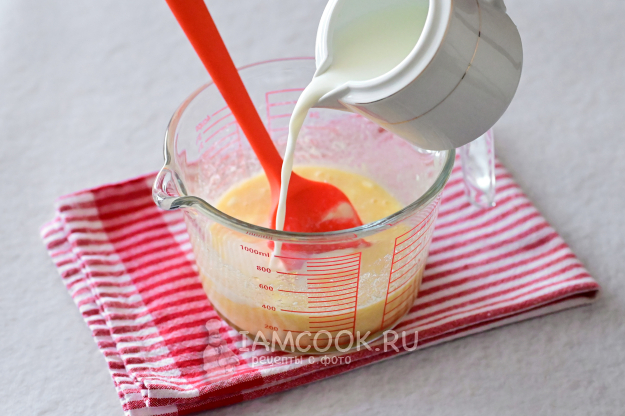 Влейте молоко (можно из холодильника, подогревать его не обязательно). И ещё раз всё перемешайте.