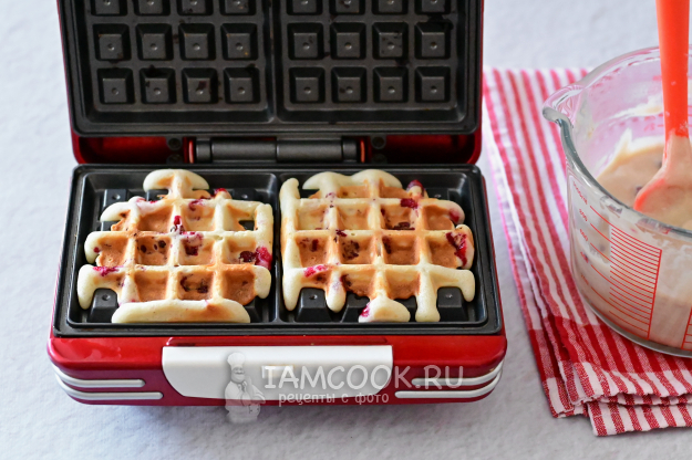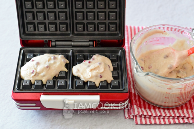 Выложите в ячейки вафельницы примерно по 1 столовой ложке теста, закройте крышку вафельницы и пеките вафли с ягодной начинкой до румяного цвета, примерно 3-5 минут.