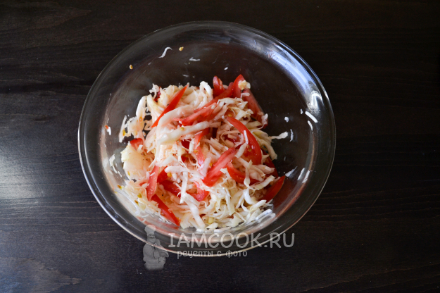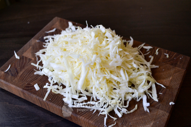 Капусту нарежьте тонкой соломкой. Чуть присыпьте сахаром и солью, помните немного руками, чтобы стала мягче.