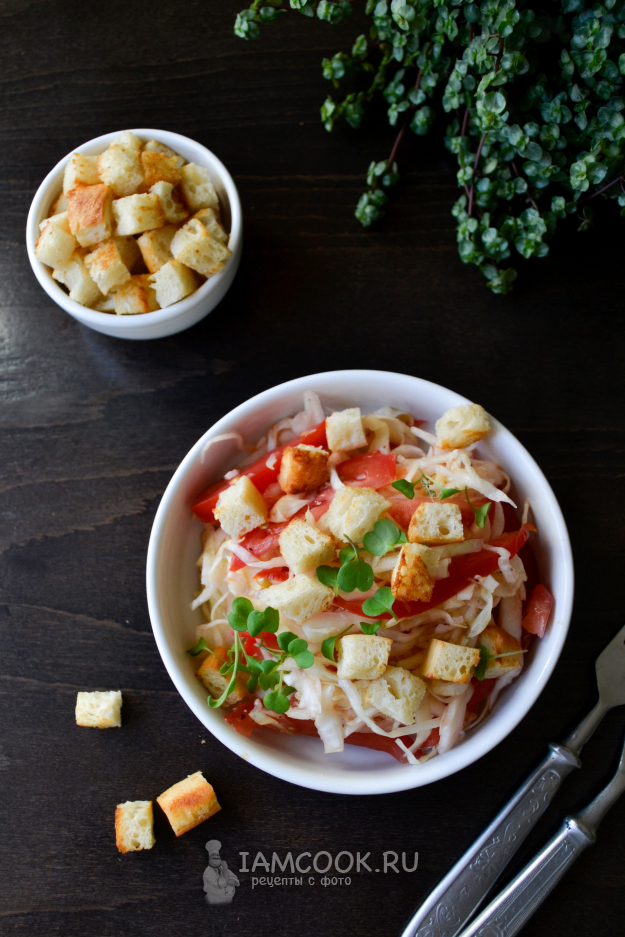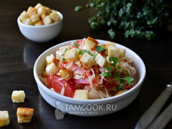 Салат из капусты и помидоров готов. Подавайте салат к столу, посыпав сухариками и свежей зеленью.