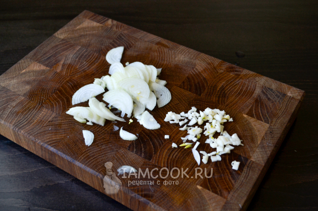 Репчатый лук нарежьте тонкими полукольцами, чеснок мелко порубите.
