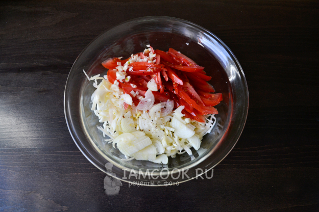 В салатник положите капусту, помидоры, лук и чеснок. Полейте салат заправкой.
