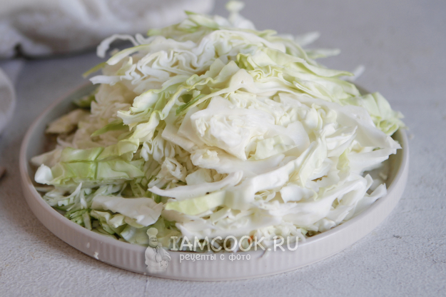 С кочана снимите верхние листочки, кочан разрежьте пополам. Нашинкуйте капусту соломкой, обходя кочерыжку.
