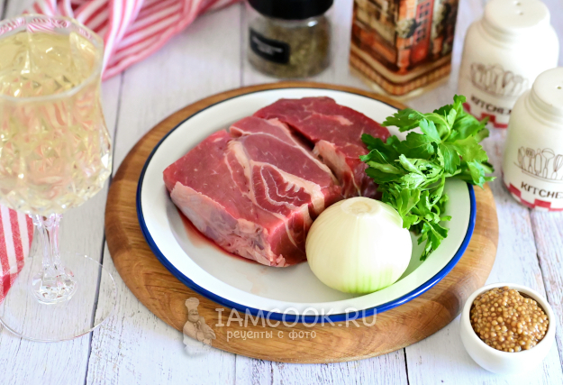 Соберите необходимые продукты для приготовления говядины с дижонской горчицей и вином на сковороде.