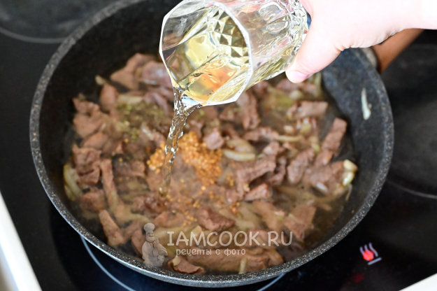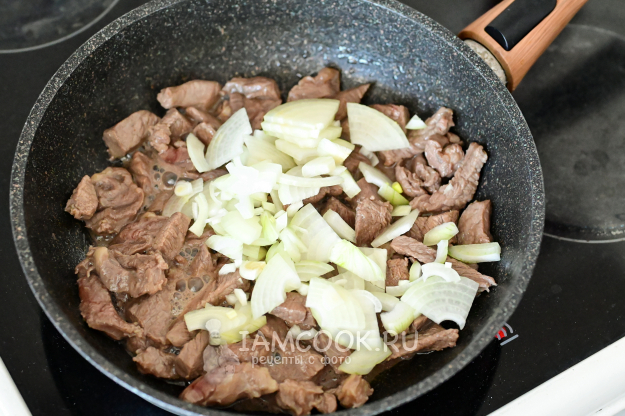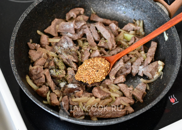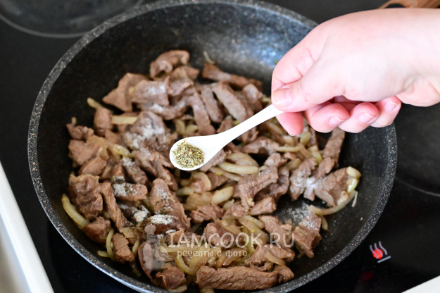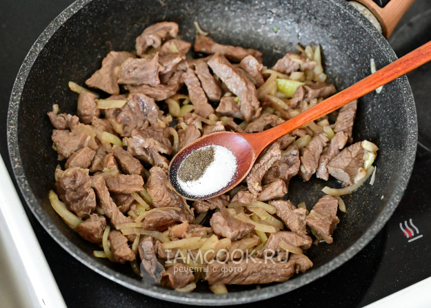 Когда говядина с луком слегка обжарятся, их нужно приправить. Само собой, соль и перец - по вкусу.