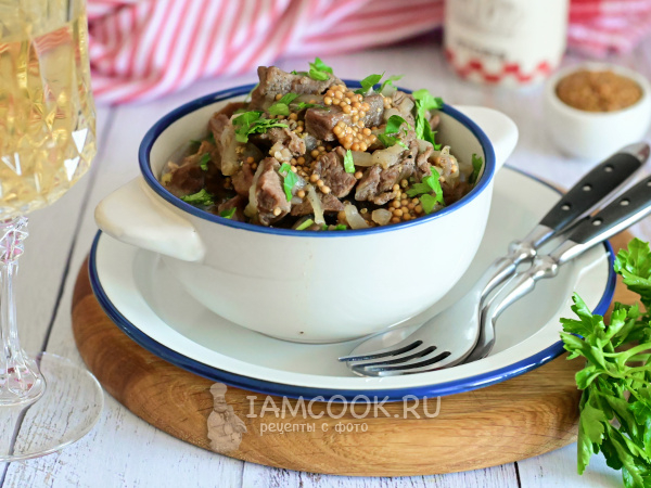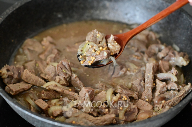 Добавьте в сковороду к мясу столовую ложку с горкой зернистой дижонской горчицы.