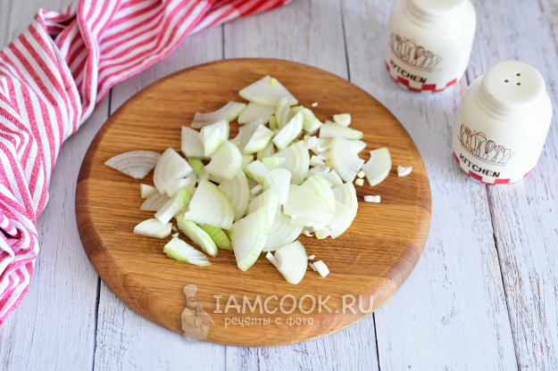 Луковицу очистите, сполосните и нарежьте четверть-кольцами.