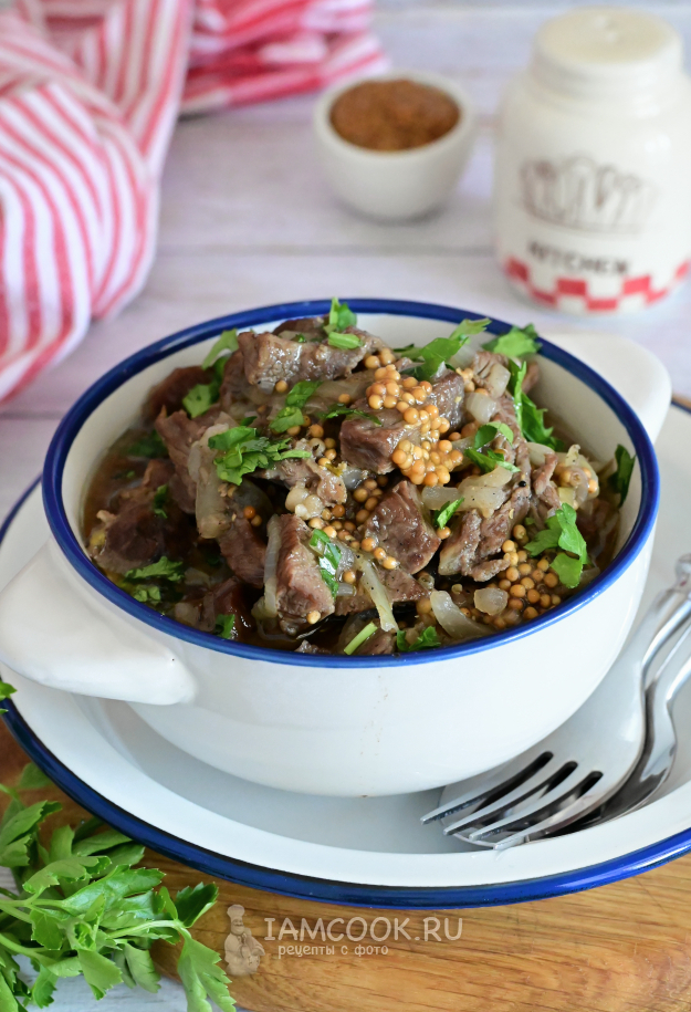 Дождитесь закипания, и можно убавить огонь на самый минимум. Сковороду накройте крышкой и томите говядину с дижонской горчицей и вином около 1 часа. Время примерное, ориентируйтесь на мягкость кусочков мяса.
