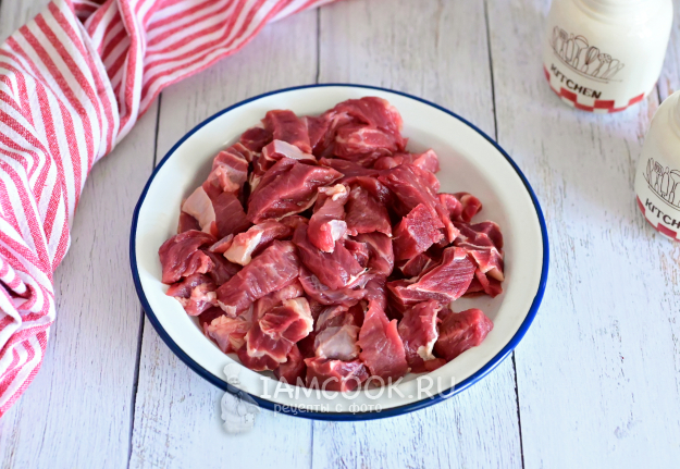 Говядину нарежьте на небольшие кусочки. Размер и форма кусочков - на своё усмотрение.