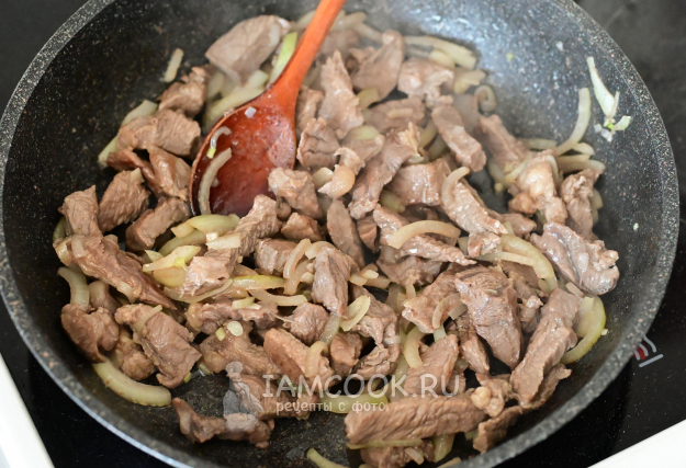 Не снижая нагрева плиты, обжаривайте лук вместе с мясом ещё примерно 5 минут. Периодически помешивайте, чтобы ничего не пригорело.