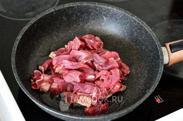 Разогрейте сковороду с растительным маслом на максимальном огне и выложите в неё кусочки говядины. Обжарьте их примерно 3-5 минут на самом сильном огне. Периодически помешивайте, чтобы кусочки обжаривались равномерно и влага испарялась.