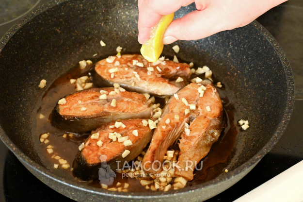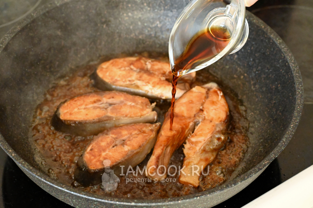 Полейте кусочки жареной рыбы соевым соусом. Количество зависит от его концентрации.