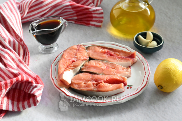Соберите необходимые продукты для приготовления жареной красной рыбы (горбуши) с чесноком.
