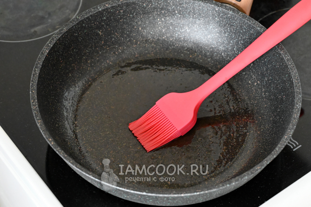 Сковороду также смажьте небольшим количеством растительного масла и разогрейте на сильном огне. Сильный огонь - это не максимальный. Для примера, я устанавливаю деление "6" из 9-ти возможных. Ориентируйтесь на особенности работы своей плиты - сковорода должна быть достаточно горячей, чтобы рыба поджарилась, но не подгорела.