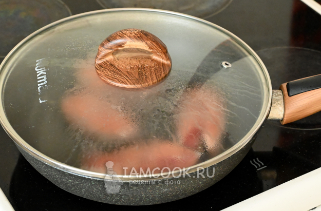 Накройте сковороду крышкой и жарьте горбушу на первой стороне примерно 2-3 минуты.