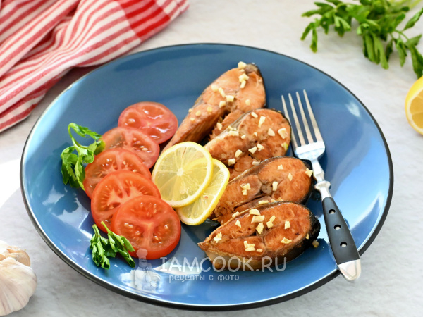 Выложите жареную красную рыбу (горбушу) с чесноком на тарелку. Дополнительно можно подать ещё пару кружочков лимона.