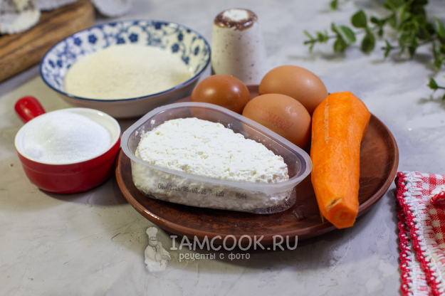 Соберите все необходимые продукты для приготовления творожно-морковной запеканки в аэрогриле.