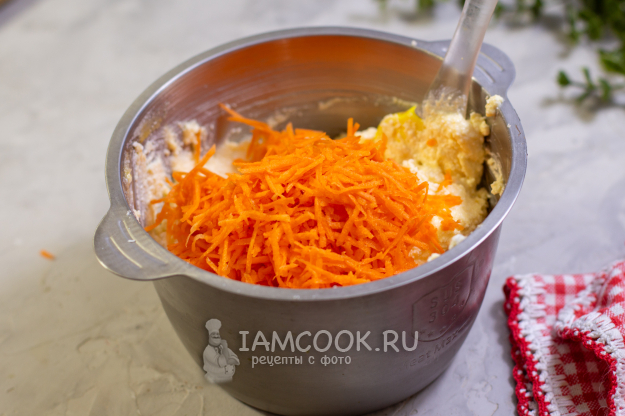 Морковь очистите и натрите на терке. Добавьте в творожную массу и тщательно перемешайте.