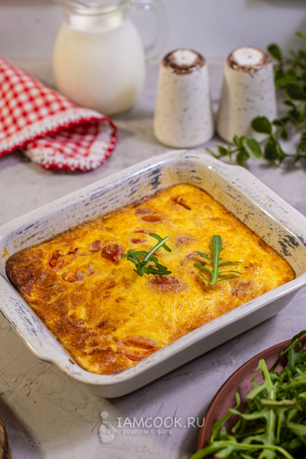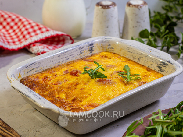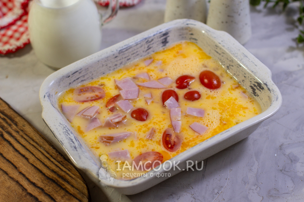 В подходящую форму налейте яичную смесь и добавьте к ней нарезанные ветчину и помидоры, аккуратно перемешайте.