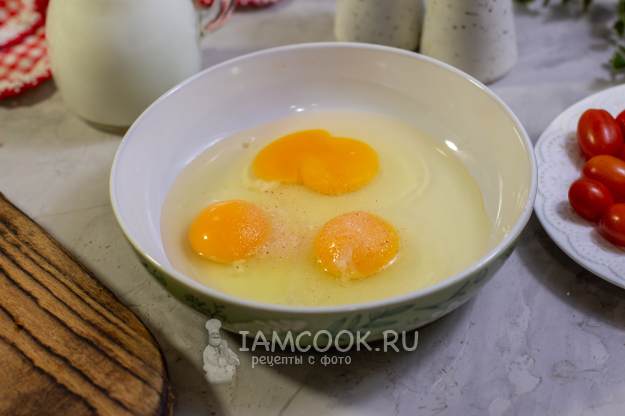 В подходящую емкость вбейте куриные яйца, посолите и перемешайте вилкой.