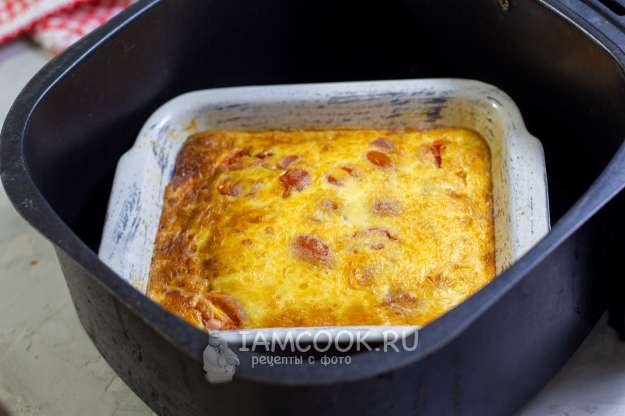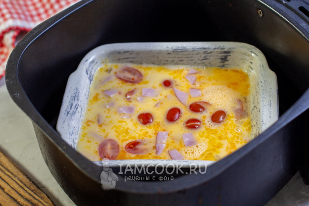 Переложите посуду с будущим омлетом в чашу аэрогриля и запекайте 20-25 минут при температуре 170 градусов. Точное время зависит от толщины омлета и модели аэрогриля. Ориентируйтесь на вашу технику.
