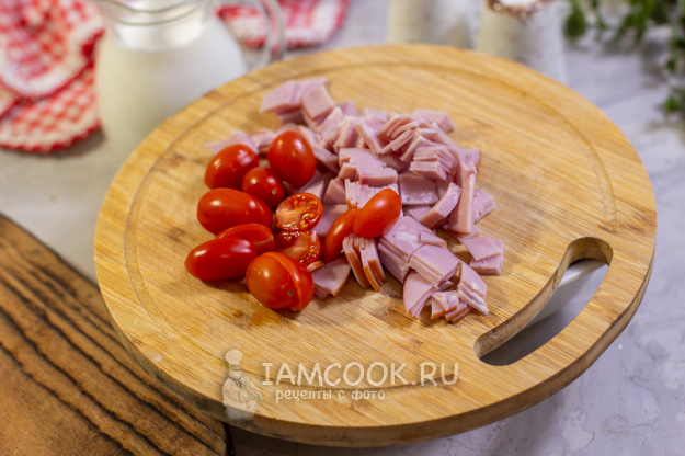 Ветчину и помидорки черри нарежьте на небольшие кусочки.