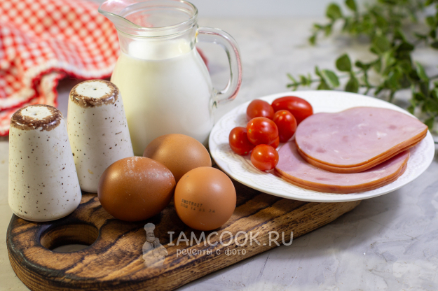 Соберите необходимые продукты для приготовления омлета с ветчиной в аэрогриле. Я буду готовить завтрак на две персоны. Если нужно больше, то увеличьте количество продуктов. По желанию в омлетную массу можно добавить тертый сыр, грибы или овощи.