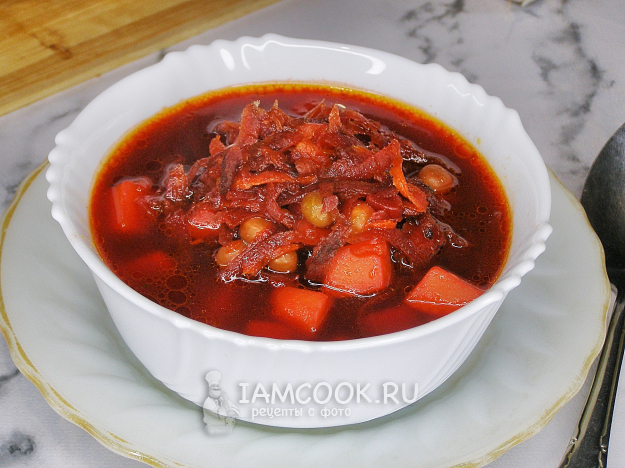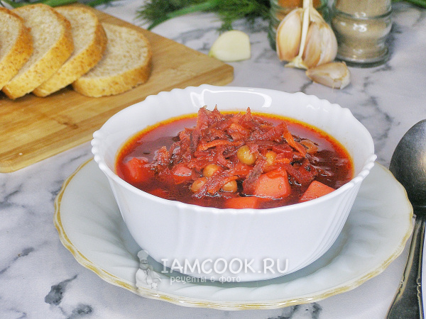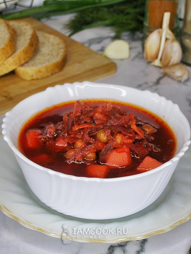 Борщ с зелёным консервированным горошком готов. Подаём его к столу в горячем виде, по желанию можно добавить в суп сметану или свежую зелень. Приятного аппетита!