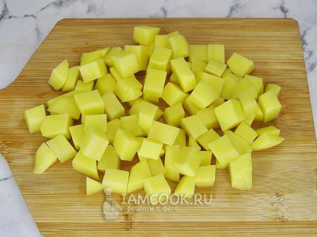 Картофель чистим, нарезаем кубиками и перекладываем в кастрюлю.