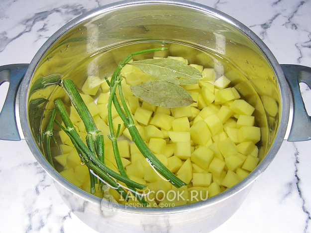 Промываем картофель холодной водой, чтобы удалить лишний крахмал. Если вы готовите постный борщ (на воде), то в кастрюлю заливаем свежую холодную воду, добавляем соль, примерно 2 чайные ложки, лавровый лист и веточки укропа для аромата.