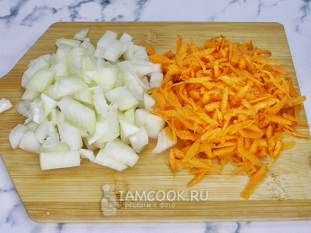 Пока варится бульон, подготовим заправку. Очищенную морковь натираем на крупной тёрке, лук режем кубиками.