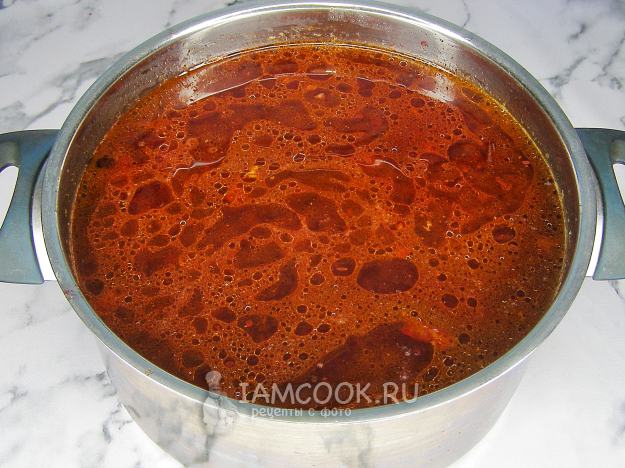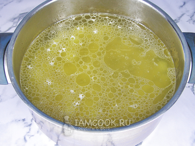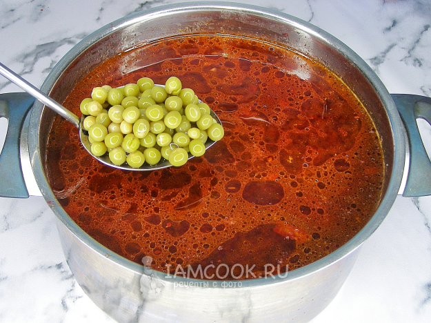 С горошка сливаем рассол и добавляем его в кастрюлю. Доводим суп до кипения и варим минут пять, затем снимаем с огня.