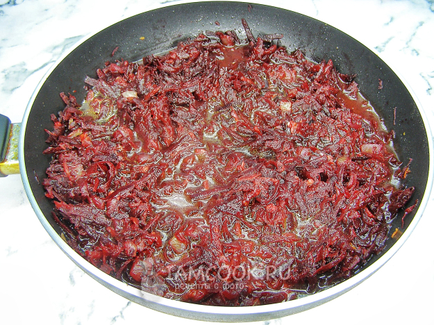 Перемешиваем, вливаем примерно 200 мл воды и тушим под закрытой крышкой на слабом огне приблизительно 15 минут, пока свекла не станет мягкой.