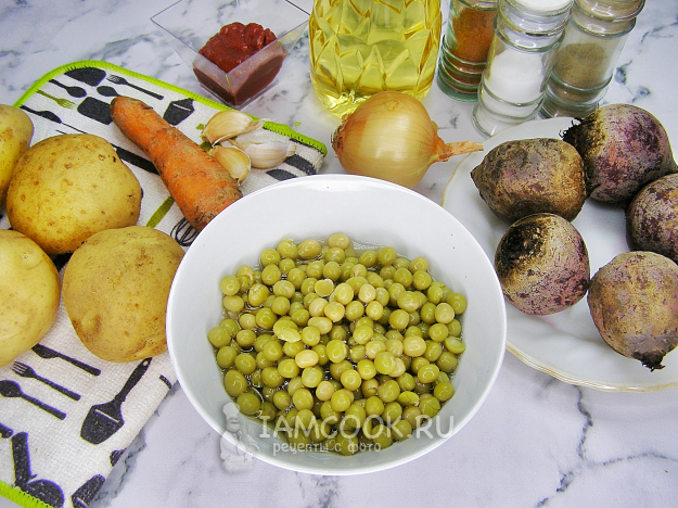 Соберём необходимые продукты для приготовления борща с консервированным зелёным горошком.