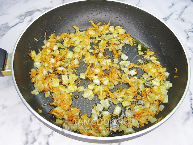 В сковороде на растительном масле обжариваем лук с морковью примерно 5 минут, пока овощи не станут мягкими.