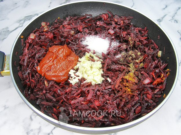 Перекладываем в сковородку натёртую свеклу и обжариваем всё вместе, помешивая, ещё примерно 5 минут. В конце добавляем измельчённый чеснок, томатную пасту, сахар, соль и молотый перец.