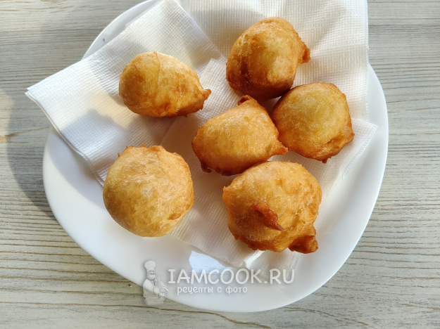 Румяные пончики выкладывать на тарелку с салфетками.