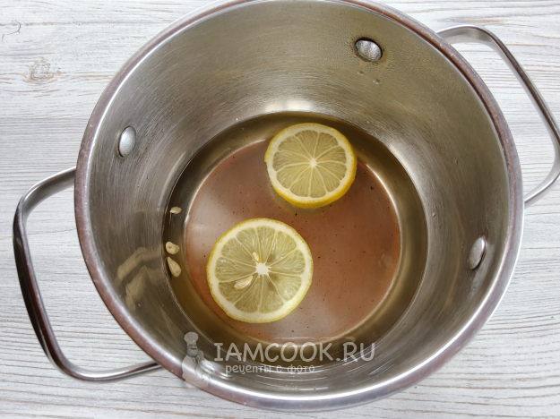 В кастрюлю налить воду, насыпать сахар, добавить пару кружочков лимона. Довести до кипения и снять с огня.